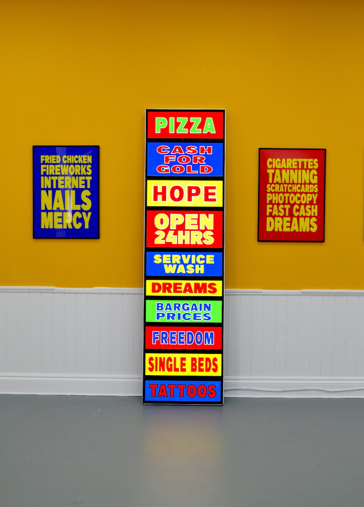 Adopting an amalgamation of cultural products, graphic design and signage appropriated from the town, this exhibition draws on these parallels, using a combination of digital photographic collage and typographic works to explore Luton’s remarkable retail environments. With local businesses often accommodating multiple unrelated businesses and services under one roof, these new works highlight the gritty optimism and entrepreneurial spirit of Luton’s communities. Beyond false nails, fried chicken, fruit and furniture, these shops offer nourishment, home comforts and connection to a community, which accommodates a diversity of beliefs and heritage, but which shares many of the same values.